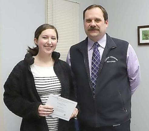 Monroe-Woodbury High School senior Kathryn Nicoll accepts a Certificate of Merit from the National Merit Scholarship Program from Principal John Kaste. Nicoll is among the finalists for the prestigious scholarships.