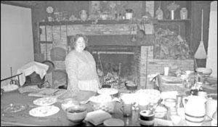 Kathie Cayton, master chef of the Pilgrim and Victorian Thanksgiving celebration dinners at Museum Village in Monroe, poses after a long afternoon this past weekend of slaving over a hot open hearth. Kathie spent the morning and afternoon preparing the Pilgrim Thanksgiving which included boyled onions, boyled sallet, stewed pompion, cornbread, cheate bread and pruen tart (with Pilgrim spellings, too). She also cooked up a Victorian Thanksgiving in comparison, which included roast turkey, cranberry sauce, chicken pie, onions, potato balls, cornbread, pumpkin pie and marlboro pudding. (Photo by Angelina T. Collins)