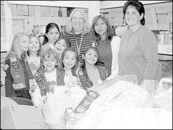 Brownie Troop 212 volunteered at the Monroe Food Pantry to help with Thanksgiving donations. Pictured from left are: Julia Frees, Amanda Guido, Rachel Levine, Jessica Castro, Jordan Castro, Bridget Morehead, Nora Jean Fields (food pantry representative), Corinna Chambers, Maria Chambers (leader), and Kathy Castro (leader). As the holidays draw near and the temperature drops, the pantry gears up to serve those in need. They are looking for donations of turkeys, stuffing, gravy, juice, and yams to help fill baskets. To make a contribution, call 783-6371 or mail a donation to: Monroe Food Pantry, c/o Monroe United Methodist Church, 47 Maple Ave., Monroe N.Y. 10950.