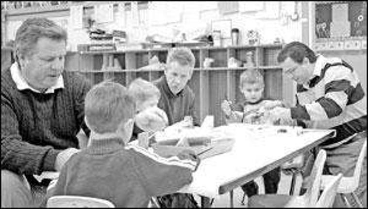 Dad’s Day was celebrated on Saturday, Dec. 3, at the St. Paul Christian Education Center on Still Road in Monroe. Children enrolled in the four-year-old nursery program shared breakfast and classroom activities with their dads. Over 160 fathers and grandfathers attended. Pictured from left are Michael Sullivan and his dad, Will Lennon and his dad, and Christopher Breen and his dad, making wooden sculptures. The center is celebrating 30 years of ministry to the community.