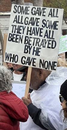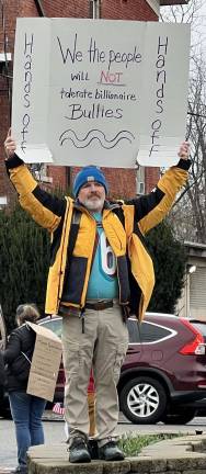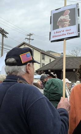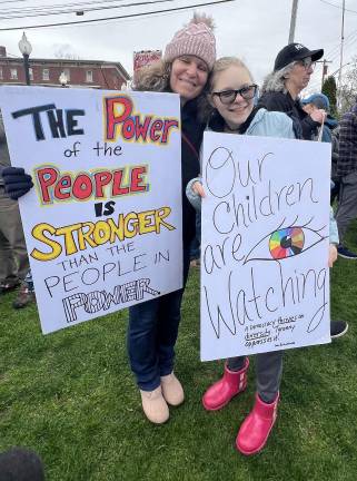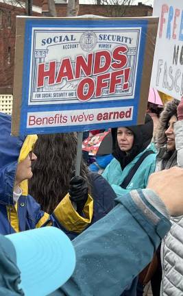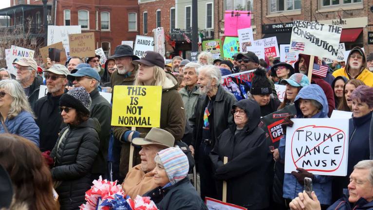 A large, enthusiastic crowd estimated at more than 600 braved chilly, rainy weather to fill Railroad Green in the Village of Warwick on April 5 at a Hands Off! rally.