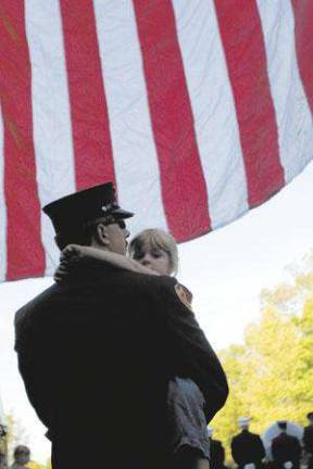Ashley Doorman is held in the arms of her father, Robert Doorman, a Town of Newburgh firefighter, during ceremonies last Sunday at Orange County Park in Montgomery marking the fourth anniversary of the attacks on the World Trade Center. (Photo by Ignacio Acevedo)