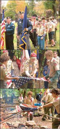American flags that become worn, torn or faded from use can be officially retired during ceremonies, usually conducted by Boy Scouts and veterans organizations. Such was the case last Sunday at the Gate House on Smith Clove Road in Central Valley. Woodbury Boy Scouts and Cub Scout Troop 149 joined with the American Legion and the Woodbury Historical Society to retire a number of American flags. Photos by Ignacio Acevedo