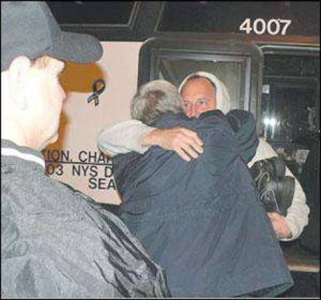 Central Valley - The victory was hours old when the caravan carrying the state champion Monroe-Woodbury Crusaders approached the line that separates Sullivan from Orange county along the Quickway Sunday evening. That’s when the first police and emergency vehicle showed up with their lights ablaze. Not because there was a problem. No, the buses and vehicles that followed the team earned a police escort because what had happened hours earlier inside a domed stadium 200 miles was special. Monroe Police Chief Dom Giudice coordinated the impromptu escort on his way home from the game and included state police and Orange County Sheriff Carl Dubois’s deputies as well as nearly a dozen ambulance and fire department crews. Impromptu, yes, but word spread quickly. The father of one player, who was traveling behind the team bus, said his son called him on his cell phone with the news. Once the parade of vehicles left the Quickway and entered Monroe, the celebration began. The emergency vehicles put on their sirens and strobe lights as spectators cheered the team as they rode down North Main Street to Route 17M, then into Harriman and finally to Monroe-Woodbury High School in Central Valley. Neil Ingenito exited the bus first, holding the championship hardware over his head. The applause almost as deafening as the sirens that announced their arrival. As the rest of the Crusaders filed off the bus, they were cheered by an exuberant group of parents, family, fans and school staff, including principal Aldo Filipone. Balloons hung from sign posts and railings and handmade signs greeted the returning champs. The loudest applause came, however, when Coach Pat D’Aliso climbed the stairs to enter the locker room for the last time this season with his New York State Championship team.