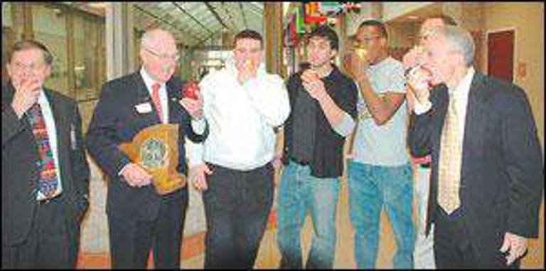 State Sen. William J. Larkin Jr. shared the spoils of victory with players and staff at Monroe-Woodbury High School this past Monday. He won a bushel of apples in a wager with a colleague because of the Crusaders’ state championship victory. From left to right, Acting School Superintendent John Canzoneri, Larkin, football captains Chris Dollbaum, Neil Ingenito, Chris Johnson, Coach Pat D’Aliso and High School Principal Aldo Filippone. Related stories, photos on page 2 and 38. (Photo by Bob Quinn)