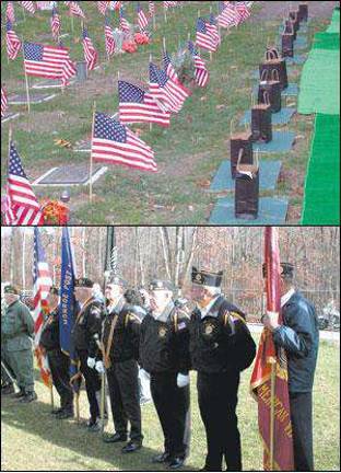 The ashes of 13 local veterans that lay unclaimed for years at the Applebee-McPhillips Funeral Home in Middletown were buried on Friday, Nov. 11, in the Orange County Veterans’ Cemetery in Goshen. The families of the veterans, who had served in wars from World War I through Vietnam, had never picked up the remains. A contingent of Monroe veterans, pictured at right, formed one of the color guards at the internment ceremony. (Photos by David Gordon)