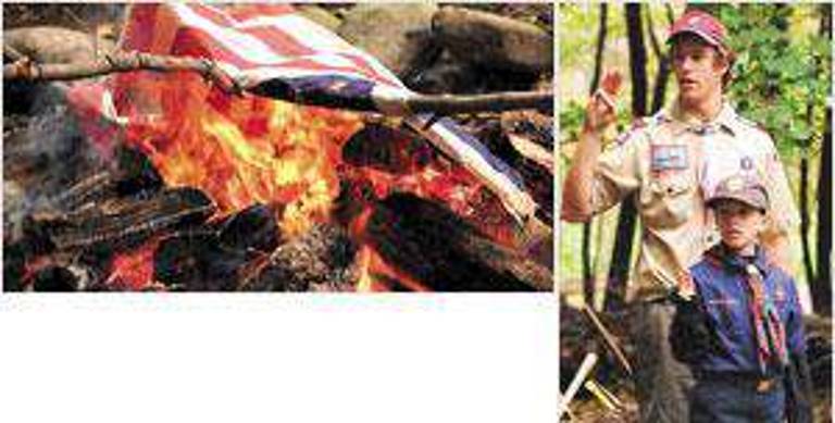 Scouts Robert Lutz (front) and Jason Elmo salute during the playing of the national anthem last Sunday during flag retirement ceremonies at the Gate House on Smith Clove Road in Central Valley. (Photo by Ignacio Acevedo)