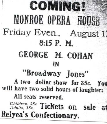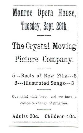 In the early Twentieth Century, Monroe did not have a movie theater; this was customary for most small towns. Movies were provided by exhibitors who traveled from town to town with their equipment and films.