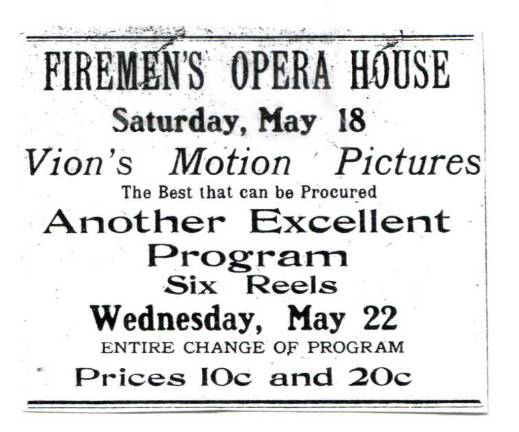 Another location for movies was the Fireman’s Opera House, which was located on Stage Road, and is now Flynn’s Funeral Home. Besides the fire equipment, it also housed the jail on the lower level, with the entertainment being held on the second floor.